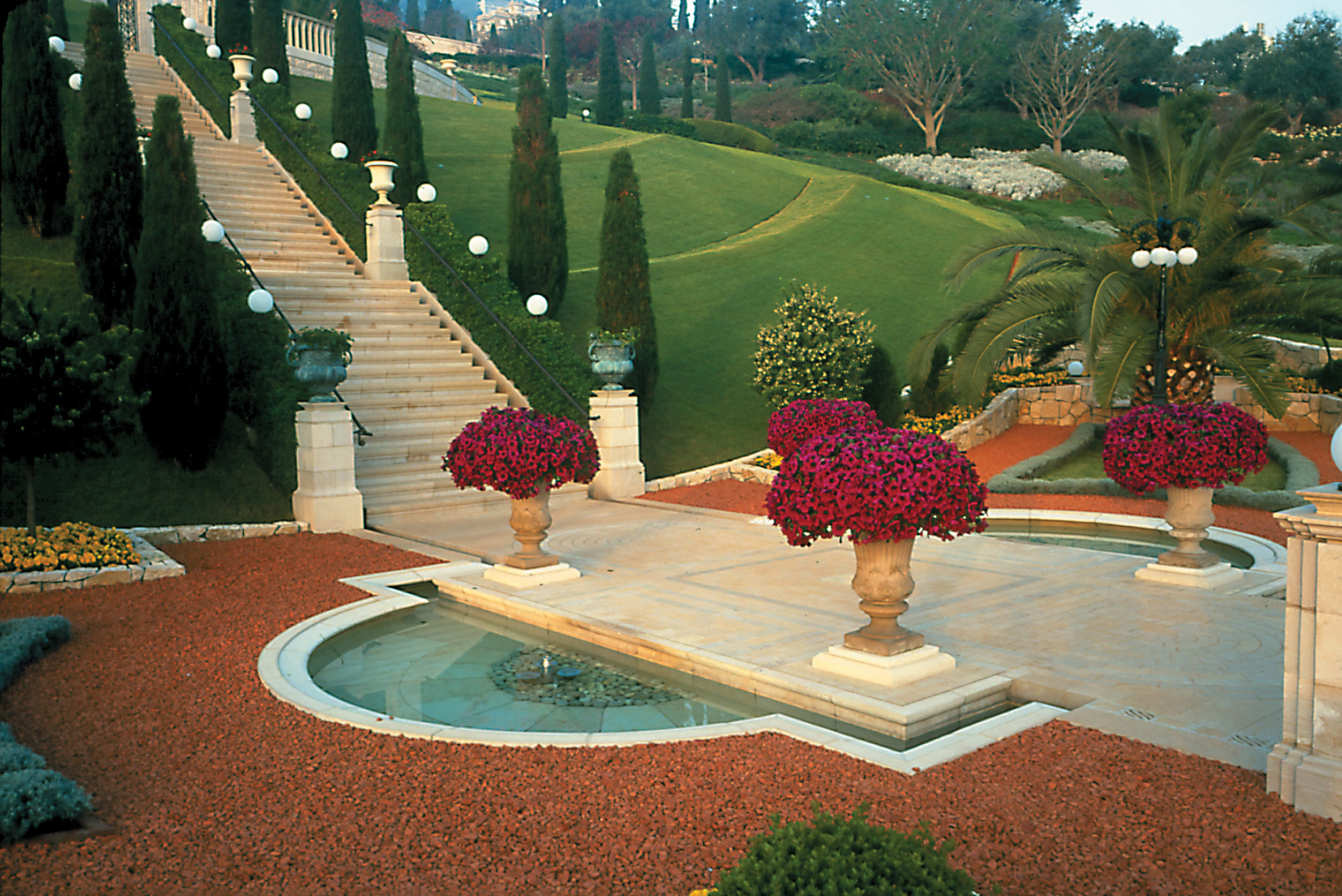 As I climbed, terrace by terrace, the noise of the busy city streets below – car horns and taxis, the talk and laughter of people at outdoor cafes – receded into the background. Flowers and foliage, the sounds of softly splashing fountains and warbling birds, became along the way the gardens of paradise – an oasis for the spirit. This place, at the heart of the planet, is a point of pilgrimage for the five million Baha’is who live in every part of the globe.